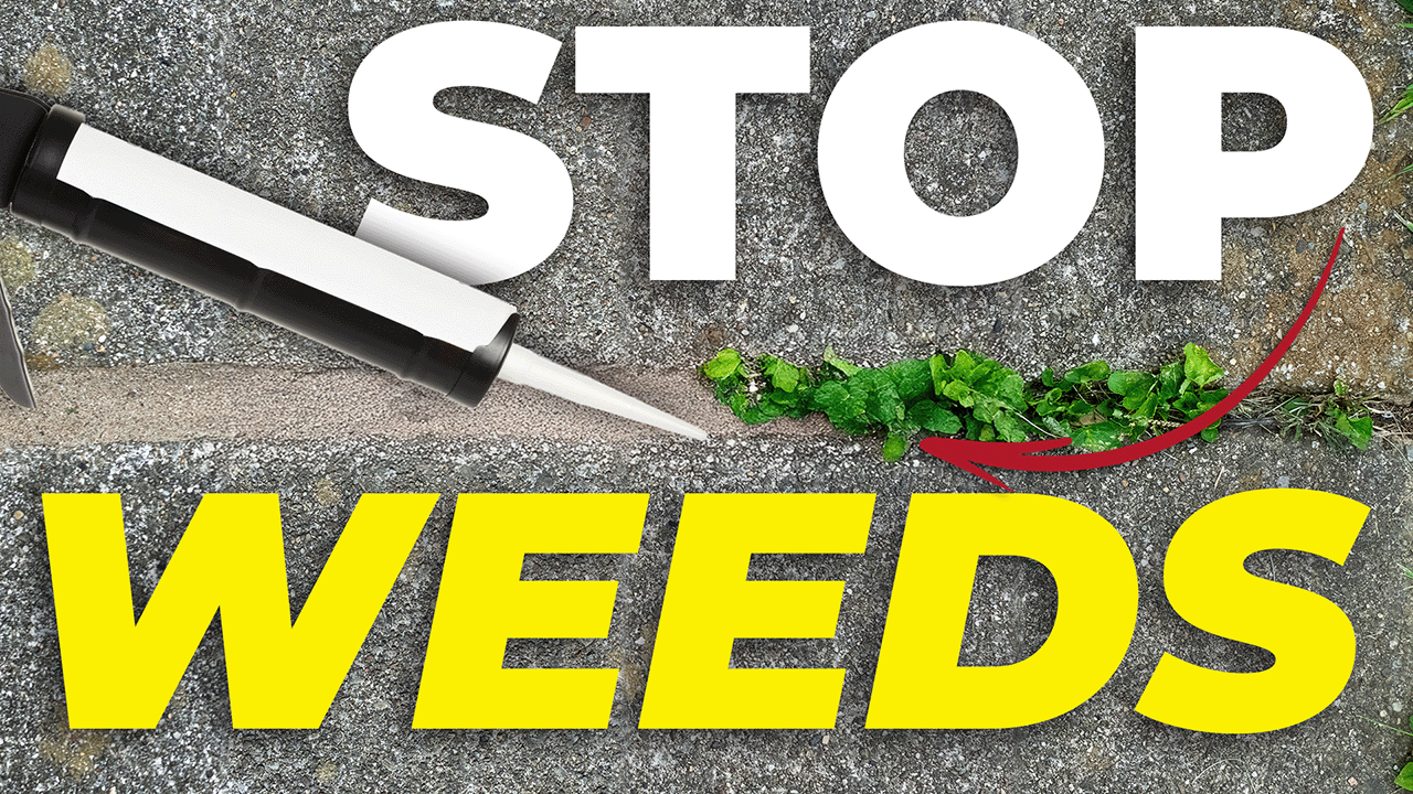 Use a flexible concrete caulk to block weeds from growing up through expansion joints, cracks, and other gaps. The caulk sticks to the concrete and doesn’t leave any room for weeds to grow.